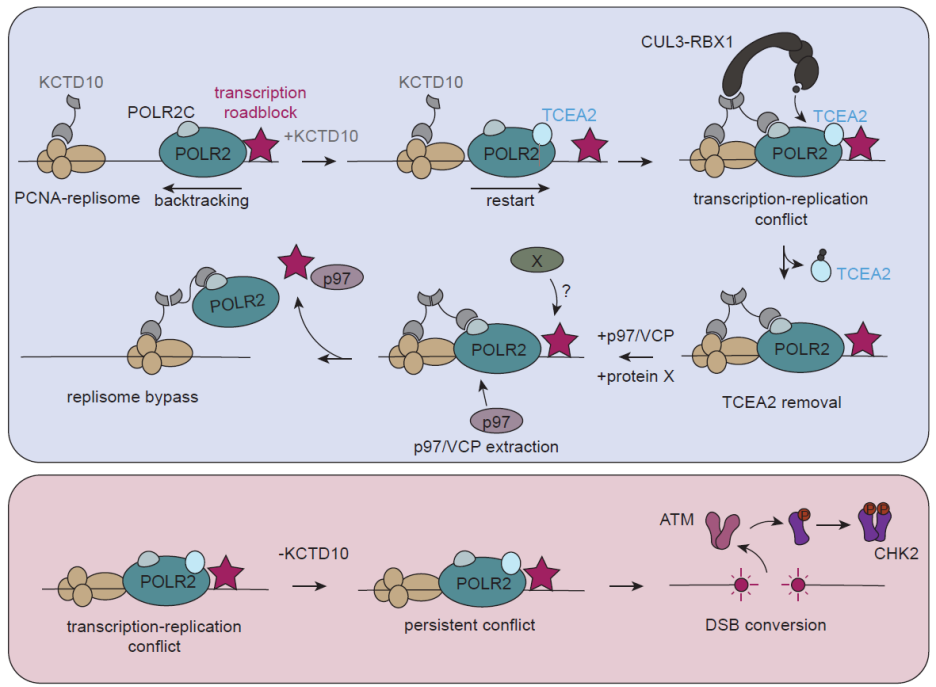 在每一个细胞分裂周期中,DNA复制与转录必须在同一片基因组上“和平共处”。DNA复制需要高速推进,以完成约30亿个碱基对的复制;而转录则需精密调控,以维持细胞命运相关基因的正常表达。然而,这两项基本过程常常在基因组上“狭路相逢”。特别是在转录活跃区域,复制叉需要穿越正在被转录的基因区域,尤其是当复制体与RNA聚合酶II(RNA Pol II)复合物共用同一DNA模板时,便容易发生所谓的转录–复制冲突(transcription-repli...
