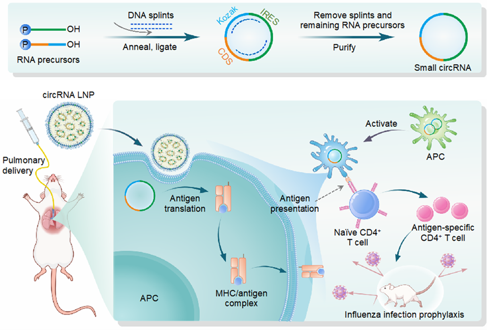 该研究开发出一种编码M2e抗原的小型环状RNA疫苗——circRNA-M2e,通过气管内给药(i.t.)并借助LNP递送系统将其输送至小鼠肺部。结果显示,circRNA-M2e可在肺部滞留并有效递送至抗原呈递细胞(APC),显著保护小鼠抵御致死剂量的流感病毒攻击,其效果优于经m1ψ修饰的线性mRNA疫苗,且未观察到明显不良反应。该研究证实了肺部递送circRNA疫苗在预防流感等呼吸道传染病方面具有重要潜力。