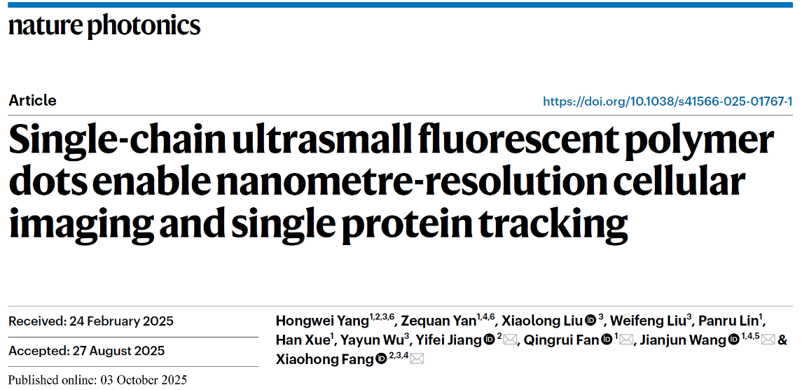 2025年10月3日,中国科学院杭州医学研究所方晓红教授团队与中国科学院理化技术研究所王健君教授团队展开跨领域合作,在国际顶尖期刊《Nature Photonics》(《自然·光子学》)在线发表题为“Single-chain ultrasmall fluorescent polymer dots enable nanometre-resolution cellular imaging and single protein tracking”(《单链超小荧光聚合物纳米点实现纳米分辨率细胞成像与单蛋白追踪》)的研究论文。该合作团队创新性提出“玻璃化冷冻”策略,通过将共轭高分子溶液低温玻璃化,以固定溶液中的每条高分子链;经去溶剂步骤后,成功制备出由单条共轭聚合物链构成的超小荧光聚合物纳米点(简称suPdots),并将其开发为新型荧光标记探针。这类纳米荧光探针的尺寸小于5纳米,不仅可实现亚细胞结构的超分辨成像,更突破了仪器限制——仅利用常规转盘共聚焦荧光显微镜,就能清晰解析单个驱动蛋白在活细胞内的运动步长,为纳米尺度超分辨成像研究提供了一款兼具强大性能与多功能性的新型工具。