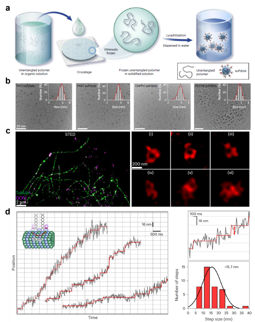 图1:(a) 玻璃化冷冻制备suPdots的示意图。(b) 四种荧光聚合物制备成suPdots的电镜图与流体动力学直径。(c) suPdots特异性标记解析网格蛋白内凹小体的纳米结构(左图)和用同一束激发光和损耗光的双色STED生物成像。(d) 活细胞内纳米分辨率解析单个驱动蛋白的运动步长。