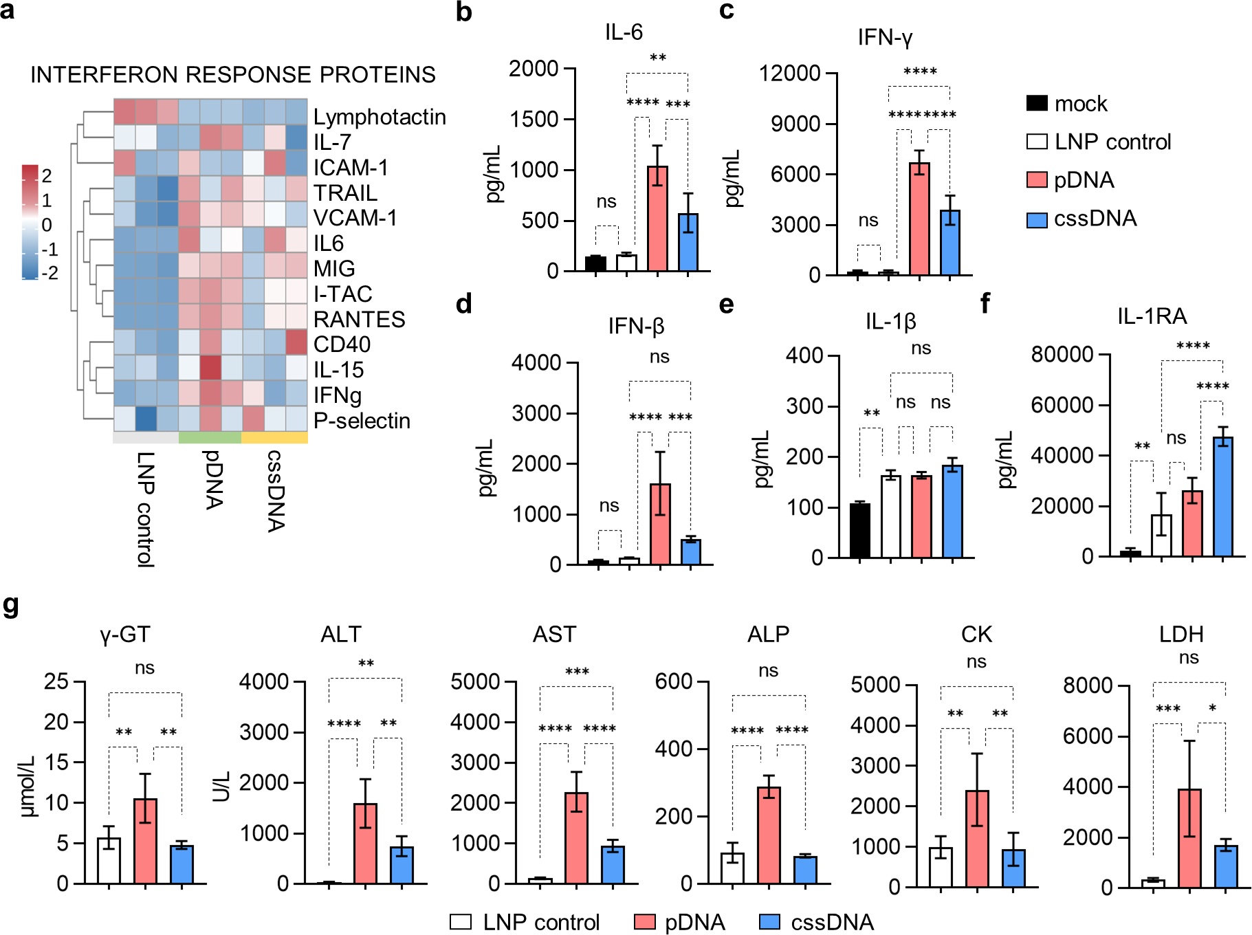 首先,研究团队系统比较了Css DNA与pDNA的免疫原性差异。将EGFP编码的Css DNA与pDNA分别包封于脂质纳米颗粒(LNP)中,经静脉注射至小鼠体内。结果显示,pDNA-LNP组小鼠血清中IL-6、IFN-γ、IFN-β等炎症因子水平急剧升高,提示其激活了强烈的先天免疫反应;而Css DNA-LNP组上述炎症因子仅微弱上升,与空载LNP对照组无显著差异。进一步分析发现,Css DNA处理组小鼠血清中IL-1受体拮抗剂(IL-1RA)特异性上调,提示机体可能启动了负反馈机制以抑制残余炎症。在高剂量毒性实验中,pDNA-LNP组小鼠死亡率达40%,并出现严重肝损伤;而Css DNA-LNP组无死亡,仅见轻微转氨酶升高,组织病理学检查未见明显炎性浸润。机制研究表明,单链结构的Css DNA无法有效结合cGAS且去除了冗余序列,这是其低免疫原性的分子基础。
