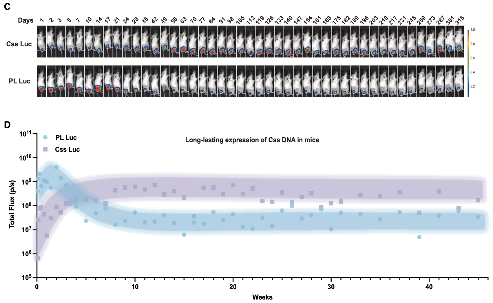 图2. Css DNA与pDNA在小鼠肌肉中的长效表达比较