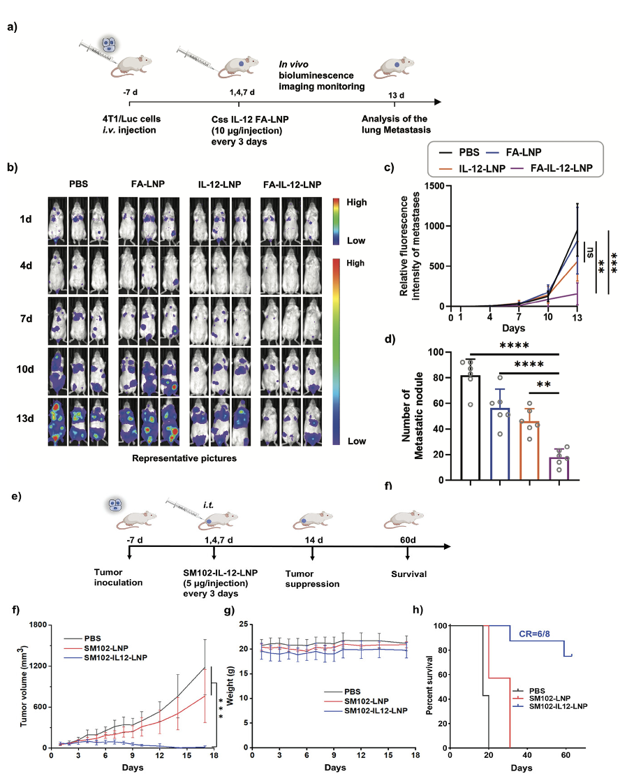 研究团队进一步探索了瘤内注射作为递送途径的可行性。在Hepa1-6小鼠肝癌皮下模型及4T1三阴性乳腺癌模型中,Css IL-12 LNP瘤内注射展现出显著治疗效果。Css IL-12 LNP组肿瘤生长受到明显抑制,部分小鼠实现肿瘤完全消退,而空载LNP对照组小鼠全部死亡。相比之下,质粒IL-12 LNP组虽也有完全缓解的个例,但肿瘤抑制速度和生存获益均略逊于Css组。在此基础上,研究团队尝试通过叶酸修饰构建靶向LNP(FA-LNP),以实现静脉注射后的主动递送。结果显示,FA-IL-12-LNP治疗组的肿瘤抑制效果显著优于非靶向对照组。