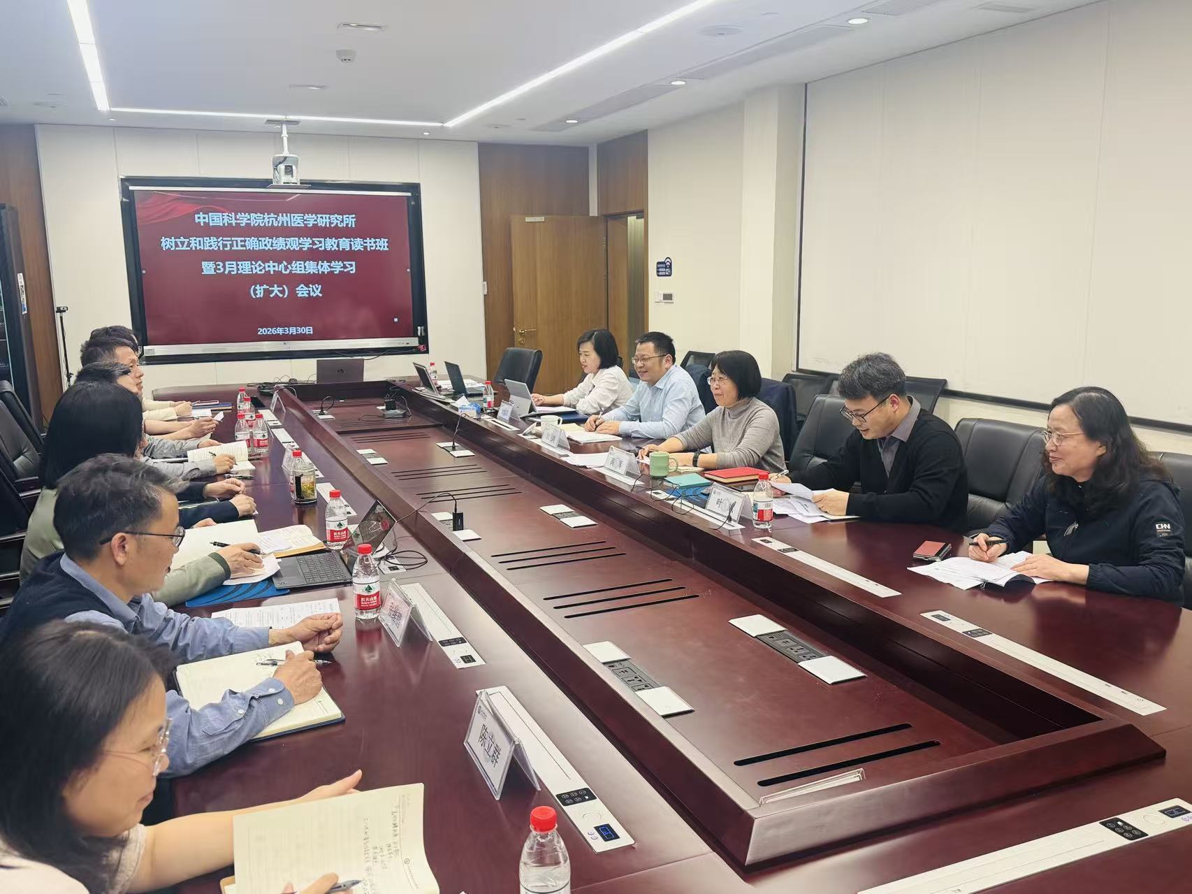 2026年3月30日,中国科学院杭州医学研究所举办树立和践行正确政绩观学习教育读书班(第一期)暨理论中心组集体学习(扩大)会议,深入学习领会习近平总书记关于树立和践行正确政绩观的重要论述。党委书记、副所长高军主持会议,党政领导班子成员和处级以上领导干部参加学习研讨。