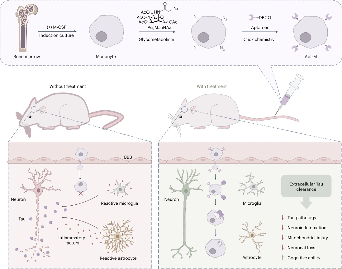 杭州医学所谭蔚泓院士与邱丽萍研究员团队,在阿尔茨海默病(AD)治疗领域取得重要研究进展。他们成功开发了一种基于核酸适体的单核细胞疗法,该疗法能够高效清除AD脑内的致病性蛋白Tau,为这一困扰全球的神经退行性疾病提供了新的治疗策略。相关研究以“Targeted clearance of extracellular Tau using aptamer-armed monocytes alleviates neuroinflammation in mice with Alzheimer’s disease”为标题,发表在《Nature Biomedical Engineering》上。